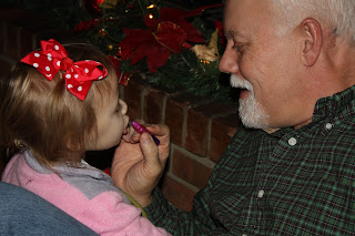 Last year, Riley and I started a few traditions with our family on Christmas Eve. It starts with the Christmas Eve Candlight Communion service at church that night. I sent both girls to the nursery so we could enjoy it (and actually they were the only ones since we have 3 times you can go...everyone with young kids went to the first service, but we couldn't do that this year). I love this service and I usually find myself crying through most of it! I feel like with all the hustle and bustle of the holidays, you sometimes loose track off what the real meaning of it all is. And of course the music gets me everytime! I also think about Riley's mom and how much she loved the Christmas eve service, too and how we wish she were here with us all the time but especially during the holidays. I just remind myelf she is having the best Christmas in heaven celebrating Jesus' birth!