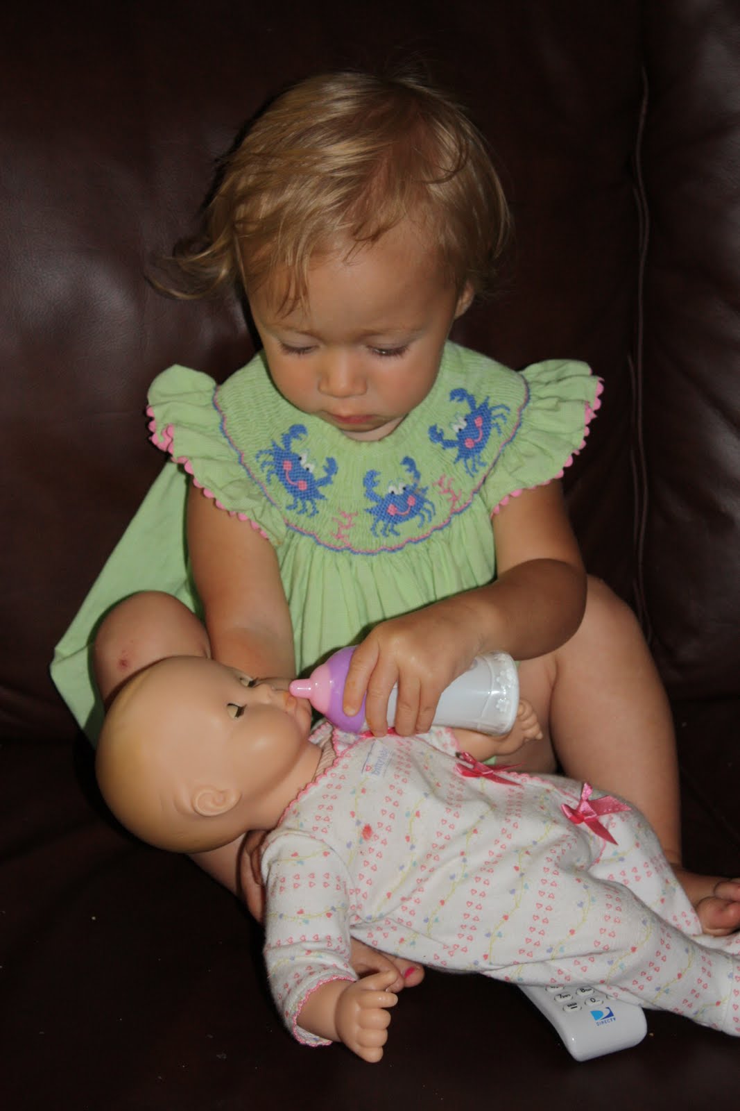 In the last month, Anna Riley has really taken to her "babies." She has always played with them but she is so motherly with them right now. She carries one of them around most of the day, feeds her, strolls her, rocks her and has one of them to sleep with her each night. Hopefully she is practicing to be a good big sister!! :)
